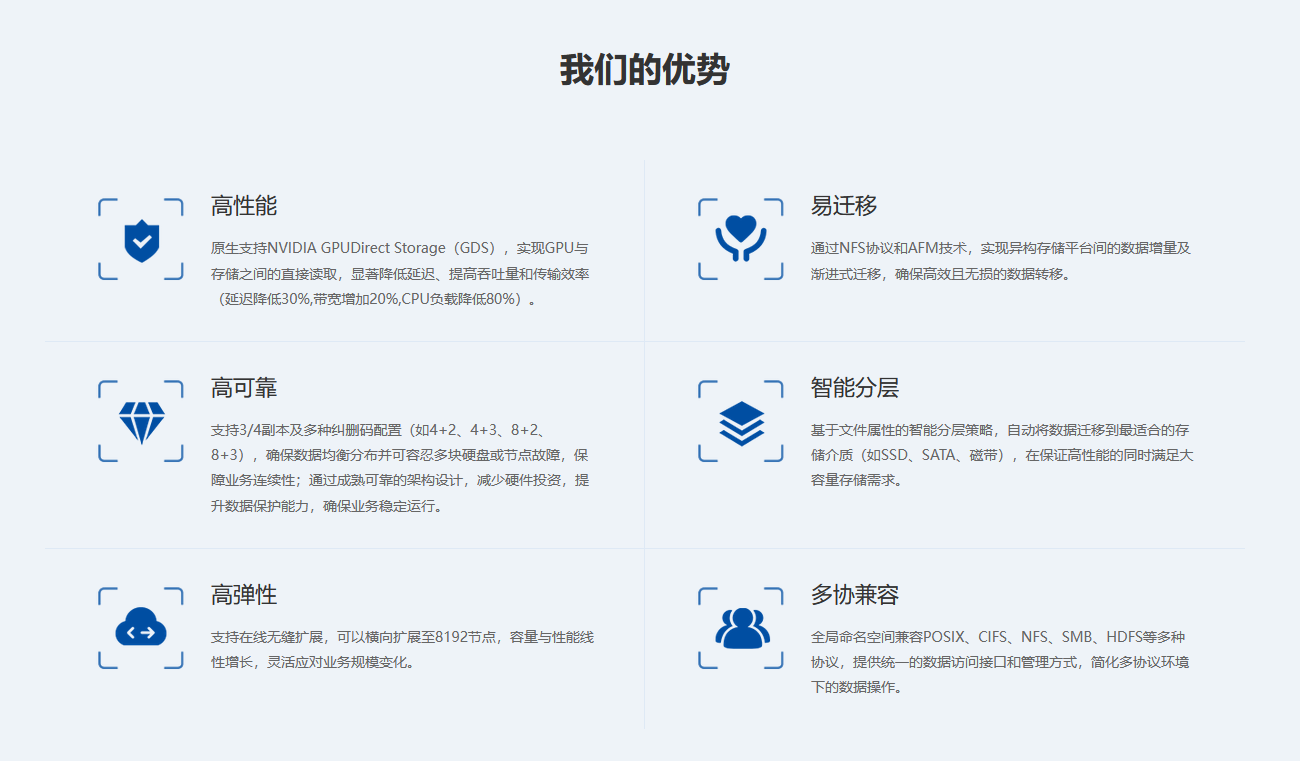 高性能分布式存儲解決方案滿足大模型訓推場景和高性能計算場景對存儲的高性能、高可靠、高彈性、易遷移、智能分層及多協兼容的需求。